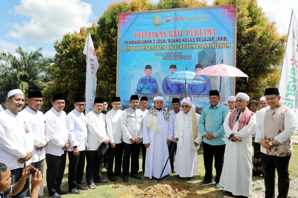 Diakhir acara, Bupati Siak Alfedri beserta Murobby Ruhina KH. Abdullah Mukhtar pendiri dan pengasuh Ponpes An-Nizom Sukabumi, Provinsi Jawa Barat, Pimpinan Pondok Pesantren Baiturrahman An-Nizom, Pimpinan Bank Riau Kepri Syariah / mewakili melakukan Peletakan Batu Pertama pembangunan 2 ruang kelas bantuan dari Bank Riau Kepri Syariah.(fen)