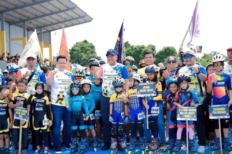 Bupati Siak, H Alfedri bersama Pembina Klub Lancang Kuning Arif Eka Saputra SPi saat melepas atlet bertanding, di Kejurnas Sepatu Roda Piala Erick Thohir 2023, di venue Sepatu Roda, Siak, Riau, Ahad (22/1/2023).