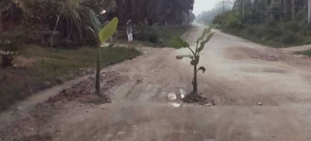 Aksi penanaman pohon pisang di jalan ini, sebagai bentuk protes warga terhadap infrastruktur penunjang masyarakat yang tak kunjung dibenahi dan terkesan dibiarkan oleh perusahaan.