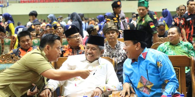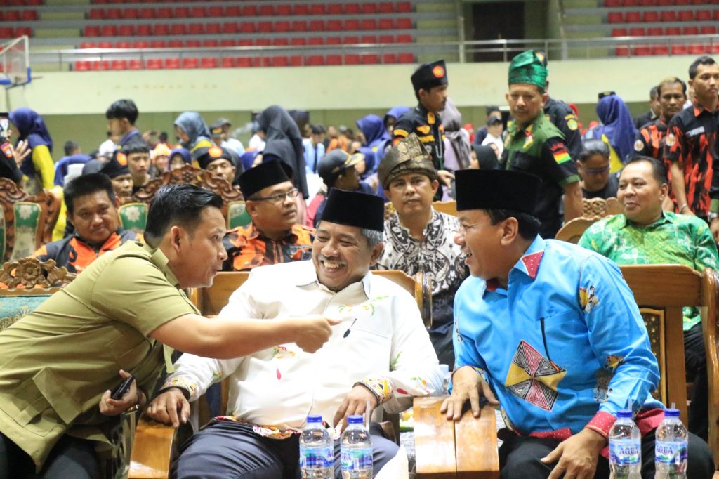 Plt Bupati Kuansing Suhardiman Amby dan Bupati Siak Alfredi saat hadir dalam pelantikan Ikatan Keluarga Kuantan Singingi (IKKS) Tualang periode 2022 – 2026.