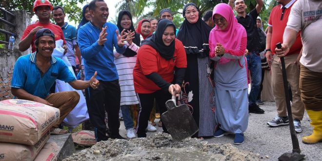 Bupati Bengkalis, Kasmarni terlihat ikut melaksanakan gotong royong bersama warga Kelurahan Pematang Pudu. (mat)
