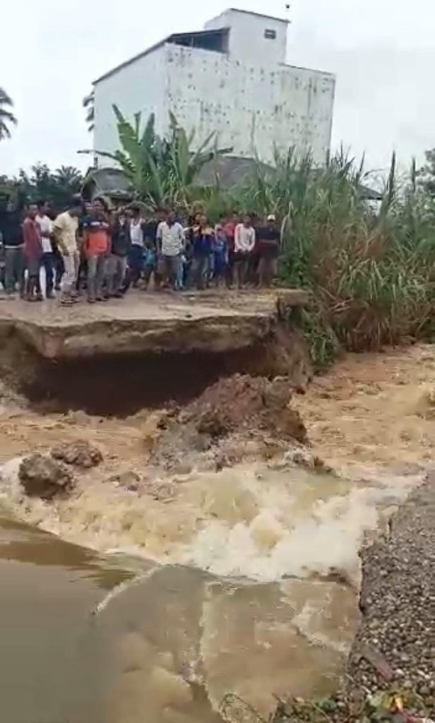 “Jalan yang putus adalah Jalinprov sebelum jalur 2 kantor camat, putusnya sekitar pukul 11 siang tadi. Saat ini jarak antara sisi jalan itu kira-kira 8 meter karena terus digerus air,” ujar Camat Bangun Purba Admiral, Selasa (21/3/2023).