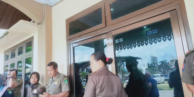 DURI (pekanbarupos.co) — Diduga takut kena marah dan melaksanakan arahan, salah seorang anggota Satuan Polisi Pamong Pradja (Satpol PP) Kecamatan Mandau melarang wartawan untuk masuk ke Ruang Aula Gedung Bhatin Betuah meliput acara mediasi antara pihak perusahaan dengan pemuda Sakai, Selasa (11/7).