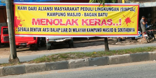 BAGANBATU (pekanbarupos.co) — Warga masyarakat  Kampung Masjid Kecamatan Bagan Sinembah yang tergabung aliansi masyarakat peduli lingkungan ( Simpul)  memasang spanduk berisi menolak keras aksi Balapan Liar.