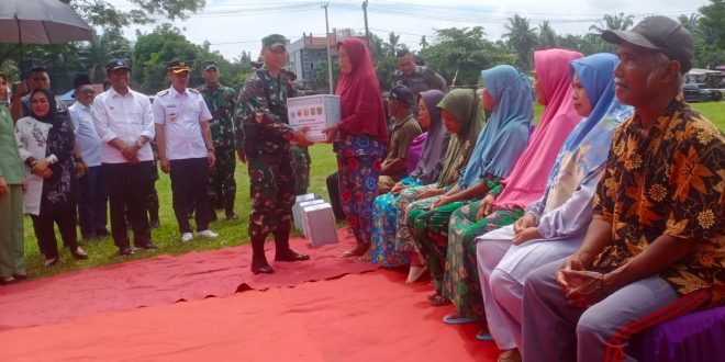 Paket sembako dibagikan kepada masyarakat kurang mampu di wilayah operasi TMMD, tepatnya di Kepenghuluan Bangko Sempurna dan Bangko Lestari Kecamatan Bangko Pusako.