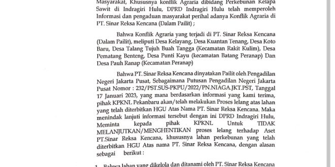 INHU (pekanbarupos.co) — Ketua DPRD Kabupaten Indragiri Hulu (Inhu) Riau berharap proses lelang aset PT sinar reksa kencana (SRK) di kecamatan Peranap dihentikan.