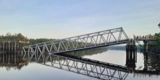 MERANTI (pekanbarupos.co) — Jembatan perawang yang menghubungkan sejumlah desa di Kecamatan Tasik Putripuyu, Kabupaten Kepulauan Meranti roboh ke sungai pada Senin (14/8) sekitar pukul 23.10 WIB.
