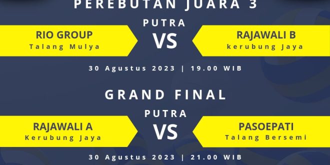 Tim putra asal tuan rumah Rajawali B akan menjamu tim putra Rio grup desa Talang Mulya pada perebutan juara 3 dan 4. Dan yang paling seru, perebutan juara 1 dan Runner up mempertemukan tim Rajawali A vs Pasoepati asal desa Talang Bersemi.