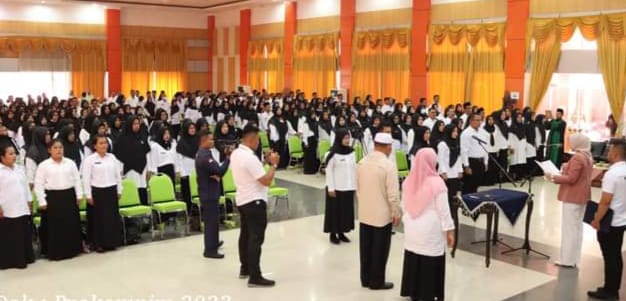 Penyerahan SK itu dimulai dengan prosesi pelantikan dan pengambilan sumpah yang digelar di Gedung Dang Purnama Rengat, Kamis (13/9/2023) siang. 306 PPPK yang menerima SK pengangkatan terdiri dari 225 jabatan fungsional guru, 79 tenaga kesehatan dan 2 tenaga teknis.