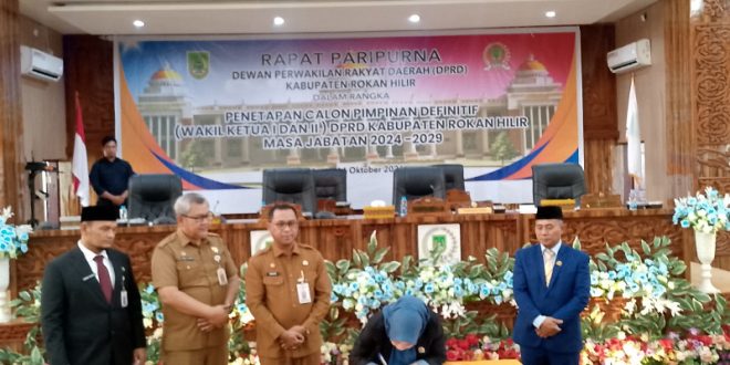 Keduanya ditetapkan pada Rapat Paripurna DPRD Kabupaten Rokan Hilir dengan agenda Penetapan Calon Pimpinan Defenitif, Wakil Ketua I dan II Kabupaten Rohil Periode 2024-2029, Senin (14/10/24).