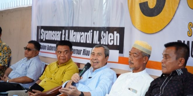 Salah seorang tokoh masyarakat Tanjung Rhu Acep Rasyidin saat sesi dialog menyampaikan beberapa aspirasi dan dukungan. Diantaranya ucapan terimakasih warga dengan telah mengalirnya air bersih minum program Pemprov Riau semasa Syamsuar menjabat Gubri.