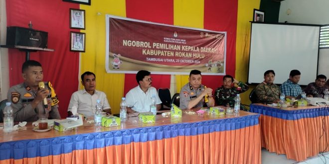 TAMBUSAIUTARA(pekanbarupos.co)-Dalam Operasi Mantap Praja Lancang Kuning Tahun 2024 (OMP-LK24) Polres Rokan Hulu (Rohul) bersama Komisioner KPU, menggelar “Ngobrol Pemilihan Kepala Daerah”, di Kantor Camat Tambusai Utara Rabu (23/10/2024) sekitar pukul 15.00 Wib.