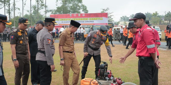 KUANSING (Pekanbarupos.co)— Dalam upaya menghadapi potensi ancaman kebakaran hutan dan lahan (Karhutla) di musim kemarau tahun ini, Polres Kuantan Singingi menggelar Apel Kesiapan Penanganan Karhutla yang berlangsung di Lapangan Apel Polres Kuansing, Selasa (22/7).