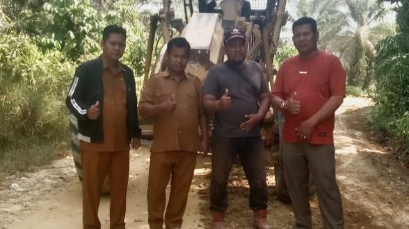 Foto Ppco : Pj Penghulu Jumrah Azizul bersama bendahara Yunizar dan operator gleder PT GMR saat melakukan perbaikan jalan.