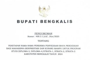 BENGKALIS (pekanbarupos.co) – Sebagaimana janji Bupati Bengkalis Kasmarni untuk tetap mengakomodir pembiayaan Beasiswa Berprestasi dan Kurang Mampu dari Studi Diploma 3 hingga Strata 3 di tahun 2024 lalu, kini Pemerintah Kabupaten Bengkalis melalui Bagian Kesejahteraan Rakyat, Sekretariat Daerah Bengkalis, mengumumkan nama-nama yang dinyatakan lulus verifikasi untuk mendapatkan beasiswa. Pengumuman ini …
