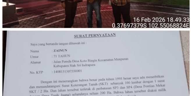 INHU (pekanbarupos.co) – Mantan kepala desa (Kades) Lubukbatu Tinggal (LBT) Kecamatan Lubukbatu Jaya Kabupaten Indragiri Hulu (Inhu) Riau, Zainun (71) membenarkan ratusan hektar lahan dan kebun milik keluarga Simarmata di Desa LBT alas hak Surat Garap dan SKT, diteken Camat.