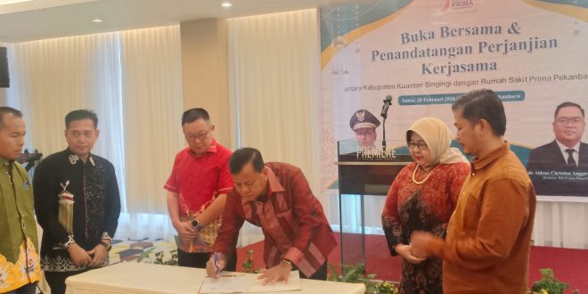 KUANSING (pekanbarupos.co)— Bupati Suhardiman Amby menyaksikan penandatanganan nota kesepahaman (MoU) penanganan pasien rujukan program Universal Health Coverage (UHC) antara Pemerintah Kabupaten Kuantan Singingi dan manajemen RS Prima Pekanbaru, Sabtu (28/2/2026) di Pekanbaru.
