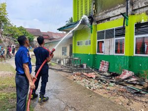 Peristiwa yang terjadi sekitar pukul 13.15 WIB ini menyebabkan bangunan sekolah dua lantai tersebut nyaris ludes dilalap si jago merah.