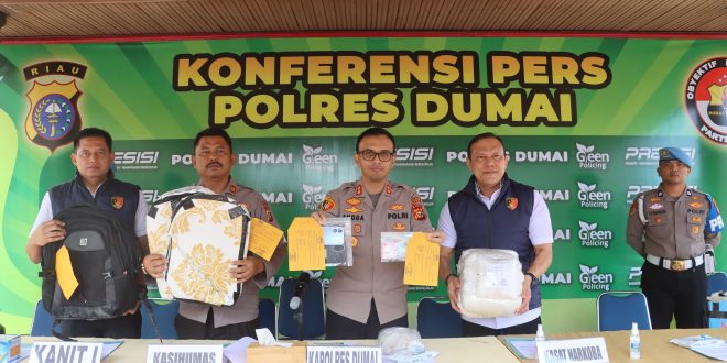 Pengungkapan kasus tersebut disampaikan dalam konferensi pers pada Rabu (11/03) yang dipimpin langsung oleh Kapolres Dumai, AKBP Angga Febrian Herlambang didampingi Kasat Narkoba Polres Dumai, AKP Riza Effyandi dan Kasi Humas Polres Dumai AKP Zaini Waluyo.