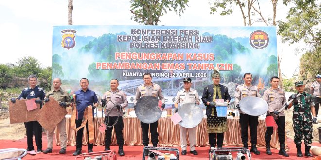 KUANSING (pekanbarupos.co)–Wakapolda Riau Brigjen Hengki Haryadi memimpin langsung jumpa pers pengungkapan kasus Pertambangan Emas Tanpa Izin (PETI) di wilayah hukum Polres Kuantan Singingi, Kamis (23/4/2026).