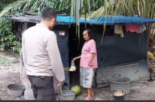 Kapolsek LTD Iptu Dodi Hajri saat berkunjung ke rumah Incang di Dusun 1 Desa Perhentian Luas Kecamatan Logas Tanah Darat. SAMSINAR alias Incang (48) sudah dua tahun belakangan ini tinggal di kandang kambing milik warga. Tepatnya di Dusun 1 Desa Perhentian Luas Kecamatan Logas Tanah Darat. Laporan M Syaifulloh, Kuansing …